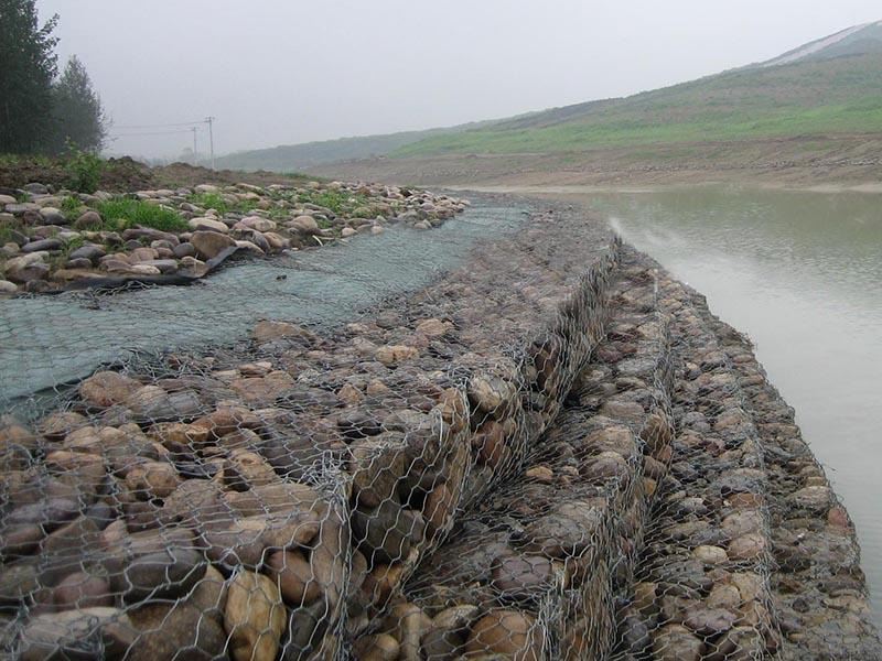 為了增強(qiáng)堤身的安全和穩(wěn)定,在堤內(nèi)腳設(shè)置了格賓石籠擋墻,堤外腳設(shè)置了格賓石籠護(hù)坡,改變了傳統(tǒng)的直接用漿砌石砌筑的做法。